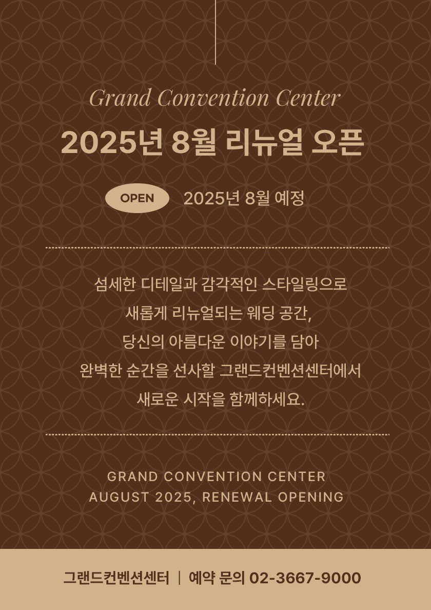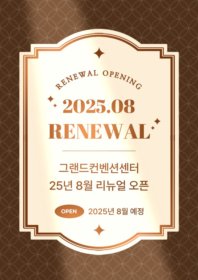 Grand News & Notice 그랜드컨벤션 소식 그랜드컨벤션센터의 새로운 소식을 전해 드립니다. [25년 8월] 그랜드컨벤션센터 리뉴얼 오픈 웹관리자 작성일2025.02.27 17:32 조회수3903 목록 이전글 이전글이 없습니다. 다음글 [News]2020년 4월 그랜드컨벤션 리뉴얼 오픈